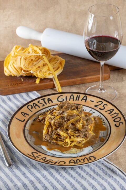 Tagliatelle ao Ragù de Pato é servido em porcelana comemorativa que o cliente pode levar