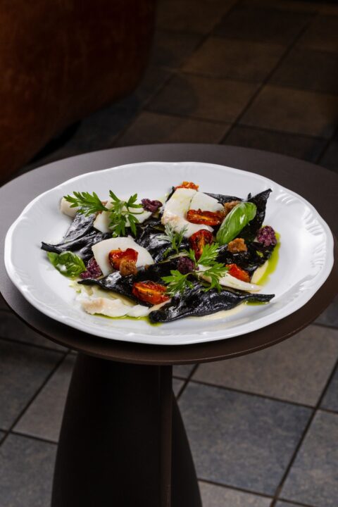 Pratos especiais dedicados a Semana Santa: Triangoli di Baccalà, ravioli nero com recheio de bacalhau e cebola caramelizada com espuma de batata e limão siciliano, tomatinhos assados, purê de cebola caramelizada, tapenade e lascas de bacalhau