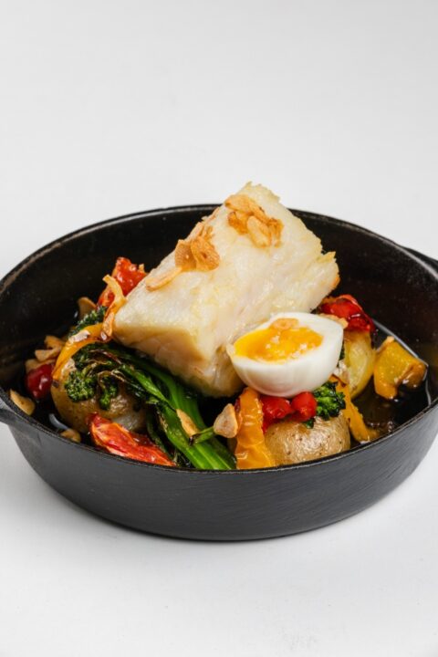Lombo de Bacalhau assado com batatinhas ao murro, pimentões, brócolis e cebola assados, regados no azeite, ovo mollet e alho crocante.