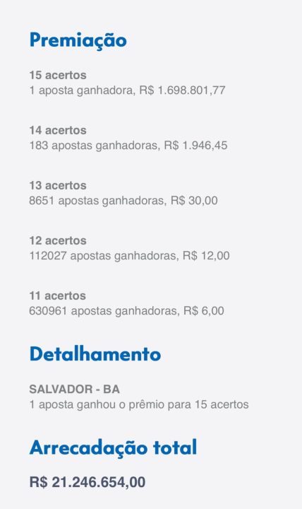 A Lotofácil 3364, sorteada pela Caixa na noite desta quarta-feira(09), premiou um apostador de Salvador (BA) com o valor de R$ 1.698.801,77. O sorteio do concurso 3364 da Lotofácil foi realizado no Espaço da Sorte, em São Paulo, e teve as seguintes dezenas sorteadas: 02, 06, 07, 10, 11, 12, 13, 14, 18, 20, 21, 22, 23, 24 e 25.