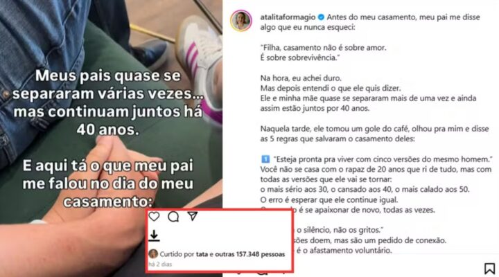 No entanto, internautas começaram a relembrar um episódio curioso que aconteceu dias antes do término ser oficializado. Tata teria curtido uma publicação que trazia um conselho de um pai para a filha sobre casamento, o que levantou especulações sobre uma possível crise no relacionamento.