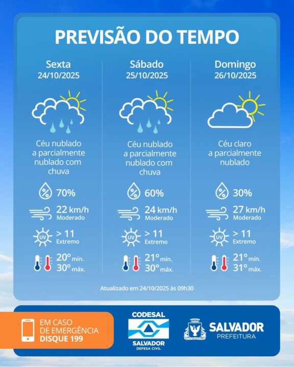 Apesar de a sexta-feira (24) e o sábado (25) ainda registrarem instabilidade e possibilidade de novas pancadas de chuva, o domingo (26) deve ser de tempo mais firme e sol predominante na capital baiana.