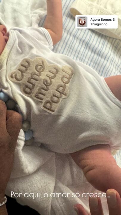 Carol Peixinho e Thiaguinho encantaram o público, através das redes sociais, ao compartilharem um clique pra lá de fofo do filho Bento. No clique, o pequeno de um mês de idade aparece usando um macacão branco personalizado com a frase ‘Eu amo meu papai’. “Por aqui, o amor só cresce”, escreveu o cantor, ao mostrar o registro. Para a publicação, o pagodeiro escolheu como trilha sonora a canção “Agora Somos 3”, uma composição sua em homenagem à família.