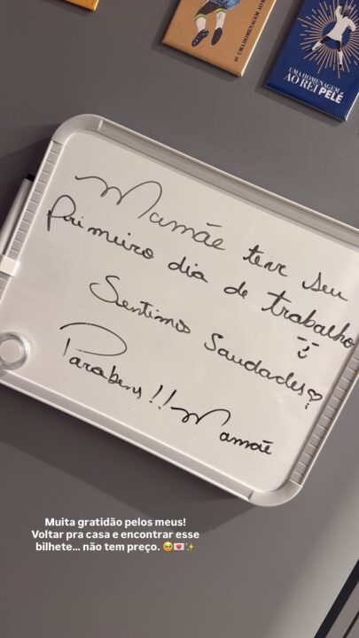 “Mamãe teve seu primeiro dia de trabalho. Sentimos saudades! Parabéns, mamãe”, diz o bilhete. Emocionada, Carol agradeceu o gesto de carinho. “Muita gratidão pelos meus! Voltar pra casa e encontrar esse bilhete não tem preço”, declarou a baiana, que também voltou a praticar exercícios físicos nesta semana.