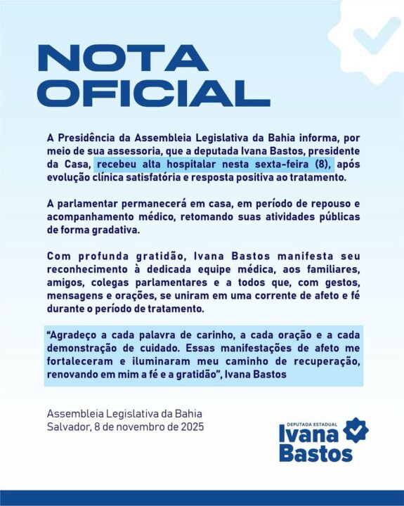 “A Presidência da Assembleia Legislativa da Bahia informa que a deputada Ivana Bastos recebeu alta hospitalar neste sábado (8), após evolução clínica satisfatória e resposta positiva ao tratamento. A parlamentar permanecerá em casa, em período de repouso e acompanhamento médico, retomando suas atividades públicas de forma gradativa”, diz a nota.