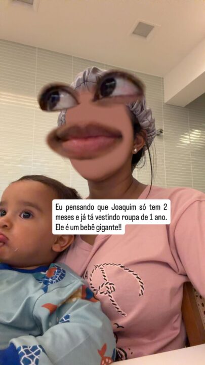 “Eu pensando que Joaquim só tem 2 meses e já tá vestindo roupa de 1 ano. Ele é um bebê gigante”, brincou a influenciadora.