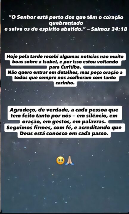 “Hoje pela tarde recebi algumas notícias não muito boas sobre a Isabel, e por isso estou voltando para Curitiba. Não quero entrar em detalhes, mas peço oração a todos que sempre nos acolheram com tanto carinho. Agradeço, de verdade, a cada pessoa que tem feito tanto por nós – em silêncio, em oração, em gestos, em palavras. Seguimos firmes, com fé, e acreditando que Deus está conosco em cada passo”, escreveu o empresário.