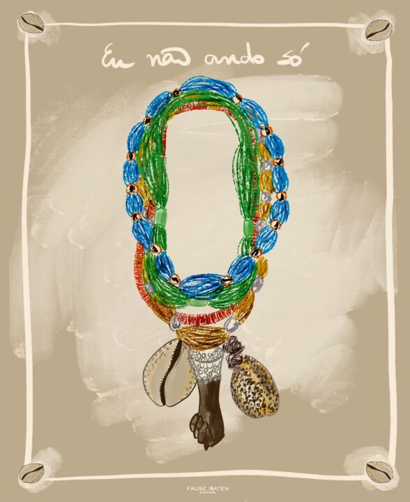 No Palacete Tirachapéu, Fause amplia seu repertório e apresenta, de forma estruturada pela primeira vez, objetos para casa que dialogam diretamente com sua produção artística. Entre os destaques estão colares de parede e de mesa, peças de grande volume, únicas e exclusivas, que fazem referência às joias crioulas e aos balangandãs, agora ressignificados como objetos decorativos. Pratos de madeira com frases e elementos dourados também integram a coleção, conectando artesanato, memória e poesia.