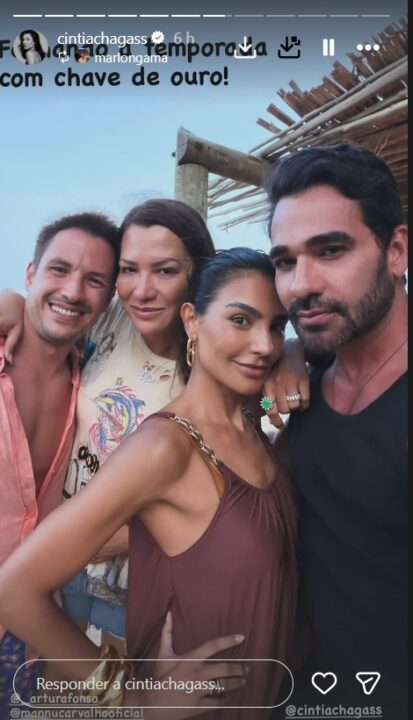 Em uma das postagens, Cintia, que está hospedada no luxuoso Hotel Fasano Trancoso, apareceu ao lado do arquiteto baiano Malon Gama e da empresária Leka Begliomini, conhecida também por sua participação no Big Brother Brasil 1.