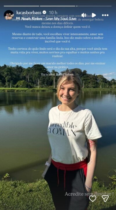 “Tenho certeza do quão lindo será o dia da sua alta, porque você ainda tem muita vida pra viver, muitos sorrisos pra espalhar e muitos sonhos pra realizar. Obrigado por me fazer um marido melhor todos os dias, por me ensinar amor na prática. Eu te amo, Isabel Veloso. Acredite sem duvidar“, completou Lucas Borbas.