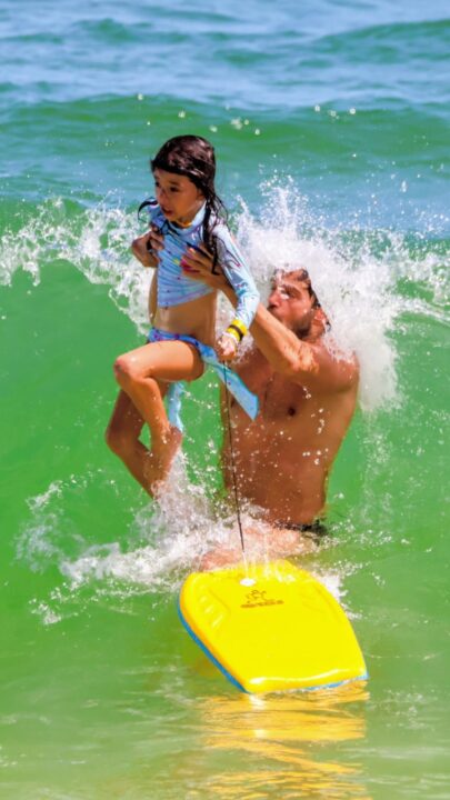 A pequena Zoe, filha de Sabrina Sato e Duda Nagle, esbanjou coragem ao ganhar uma aula de surfe do pai. O ator e empresário aproveitou o dia ensolarado neste sábado (10) para curtir uma praia com a herdeira, de sete anos de idade, e a nova namorada, a nutricionista Mariane Heller, e compartilhou registros do passeio através das redes sociais. Nos cliques, pai e filha aparecem sorridentes, em clima de descontração no mar.