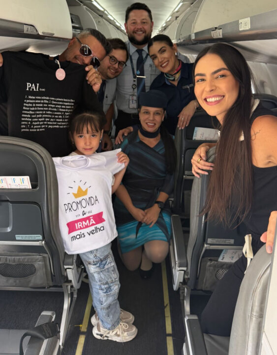 O casal, natural de Belo Horizonte, viajava acompanhado da filha, Olivia, que também não sabia da novidade. No ar, o comandante leu uma mensagem escrita por Ana, dedicada ao marido. A revelação foi seguida por aplausos dos passageiros e das comissárias de bordo.
