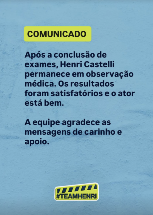 “Após a conclusão de exames, Henri Castelli permanece em observação médica. Os resultados foram satisfatórios e o ator está bem. A equipe agradece as mensagens de carinho e apoio”, diz a nota.
