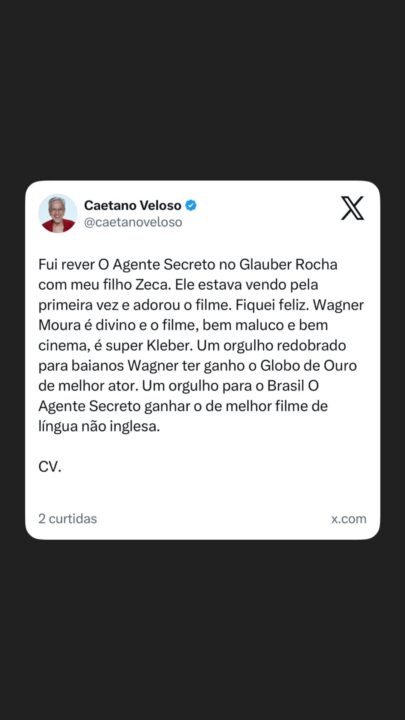 “Fui rever O Agente Secreto no Glauber Rocha com meu filho Zeca. Ele estava vendo pela primeira vez e adorou o filme, Fiquei feliz. Wagner Moura é divino e o filme, bem maluco e bem cinema, é super Kleber. Um orgulho redobrado para baianos Wagner ter ganho o Globo de Ouro de melhor ator. Um orgulho para o Brasil O Agente Secreto ganhar o de melhor filme de língua não inglesa”, escreveu Caetano.