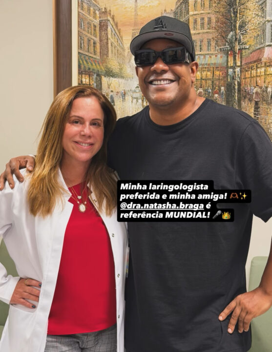 Bem-humorado, o artista compartilhou os bastidores do check-up nas redes sociais, incluindo imagens de uma ultrassonografia na região do pescoço, acompanhado pela médica Natasha Andrade Braga, a quem chamou de “referência mundial”.