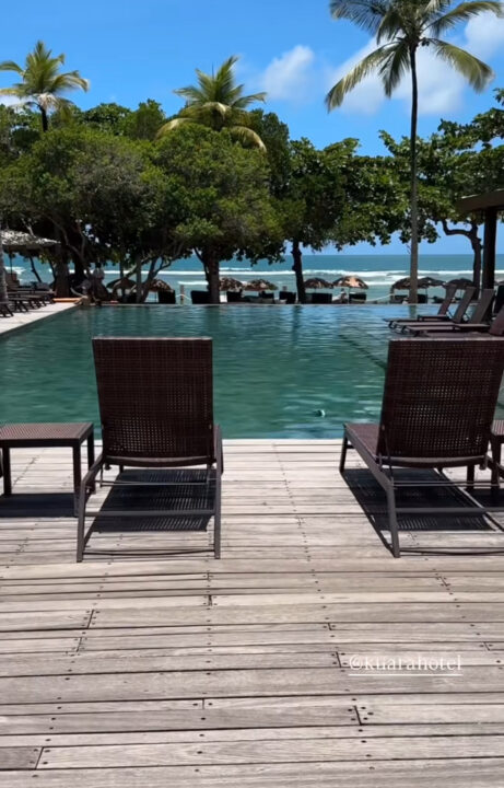 Nas redes sociais, Cíntia compartilhou alguns detalhes de sua hospedagem no Kûara Hotel, localizado na Praia de Mucugê.