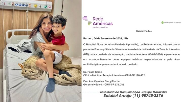 “O Hospital Nove de Julho (Unidade Alphaville), da Rede Américas, informa que a paciente Eliemary Silva da Silveira foi transferida da Unidade de Terapia Intensiva (UTI) para a unidade de internação, na data de ontem (03/02/2026), e permanece em acompanhamento pelas equipes médicas especializadas e pela área multidisciplinar para continuidade do cuidado”, diz o boletim assinado pelo Dr. Paulo Tierno e pela Dra. Ana Carolina Giorgi Martin.