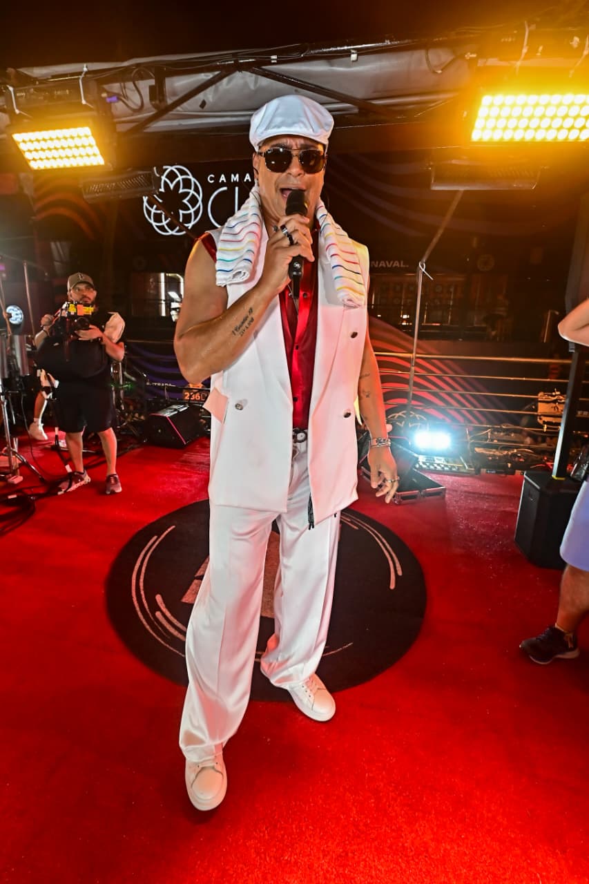 Xanddy também levou a homenagem a Riachão para o figurino da noite. O cantor surgiu com um look inspirado no visual marcante do sambista baiano, usando boina branca, óculos escuros e um conjunto em tons de branco e vermelho, acompanhado de uma toalha listrada sobre os ombros, peça que remete ao estilo característico do mestre do samba.