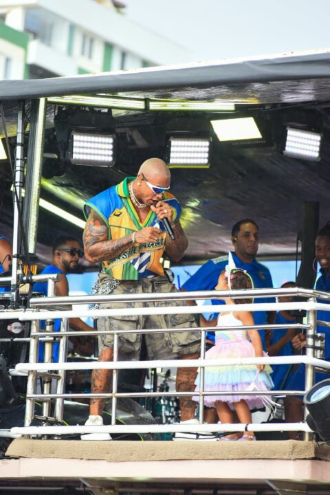 Léo Santana comanda o Bloco do Nana com uma companhia muito especial nesta sexta-feira (13): a filha Liz subiu no trio para acompanhar a saída do bloco. É a primeira vez da pequena no Carnaval de Salvador.
