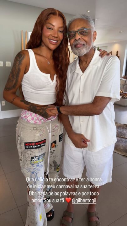 A cantora Ludmilla, que iniciou sua maratona de Carnaval com um desfile histórico no circuito Dodô (Barra/Ondina), viveu um momento pra lá de especial durante sua passagem pela capital baiana. Acompanhada da esposa, a dançarina Brunna Gonçalves, a artista foi recebida por Gilberto Gil para um almoço especial promovido pelo cantor em seu apartamento no Corredor da Vitória. Através das redes sociais, ela fez questão de expressar seu carinho e admiração pelo ídolo.