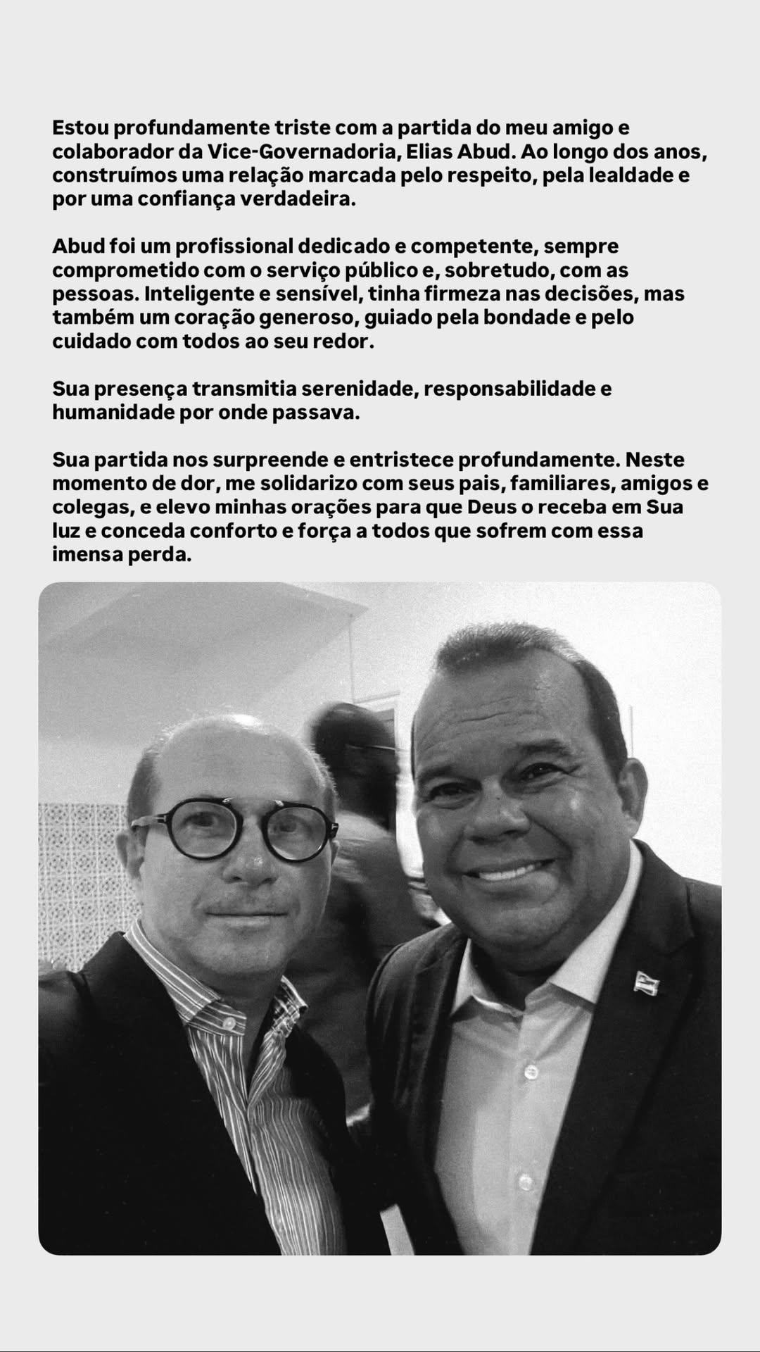 Na mensagem, Geraldo Júnior destacou a relação construída ao longo dos anos e escreveu: “Estou profundamente triste com a partida do meu amigo e colaborador da Vice-Governadoria, Elias Abud. Ao longo dos anos, construímos uma relação marcada pelo respeito, pela lealdade e por uma confiança verdadeira.”