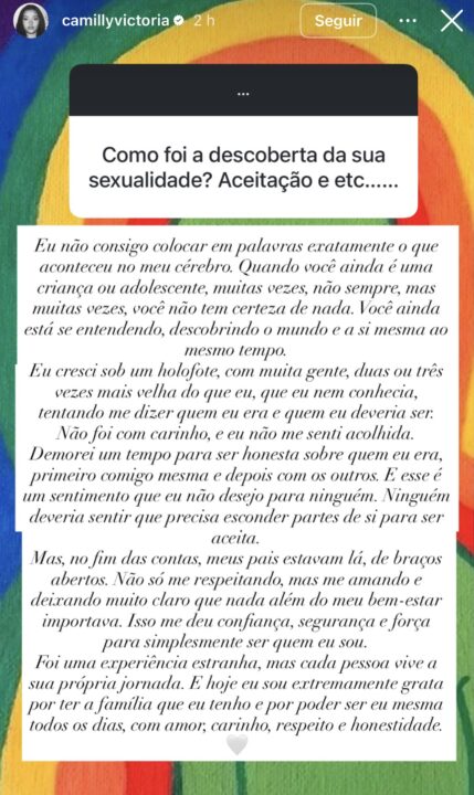 “Ninguém deveria sentir que precisa esconder partes de si para ser aceita. Mas, no fim das contas, meus pais estavam lá, de braços abertos. Não só me respeitando, mas me amando e deixando muito claro que nada além do meu bem-estar importava. Isso me deu confiança, segurança e força para simplesmente ser quem eu sou. Foi uma experiência estranha, mas cada pessoa vive a sua própria jornada. E hoje eu sou extremamente grata por ter a família que eu tenho e por poder ser eu mesma todos os dias, com amor, carinho, respeito e honestidade”, declarou.