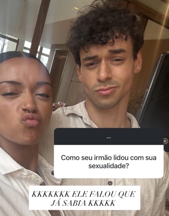 A dinâmica com o irmão caçula também foi pauta entre as perguntas. Ao ser questionada sobre a reação de Victor Alexandre, ela foi breve e bem-humorada: “Ele falou que já sabia”.