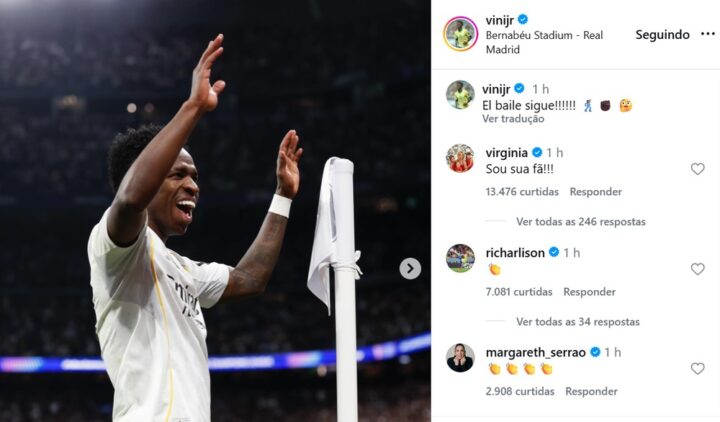 Vini Jr. usou as redes sociais nesta quarta-feira (25) para celebrar a vitória do Real Madrid sobre o Benfica em partida válida pela Liga dos Campeões. Na publicação, o craque do time espanhol compartilhou registros do confronto e ganhou uma declaração especial da namorada, a influenciadora Virgínia Fonseca, que fez questão de parabenizar o amado pela conquista. “Sou sua fã”, escreveu ela, nos comentários.