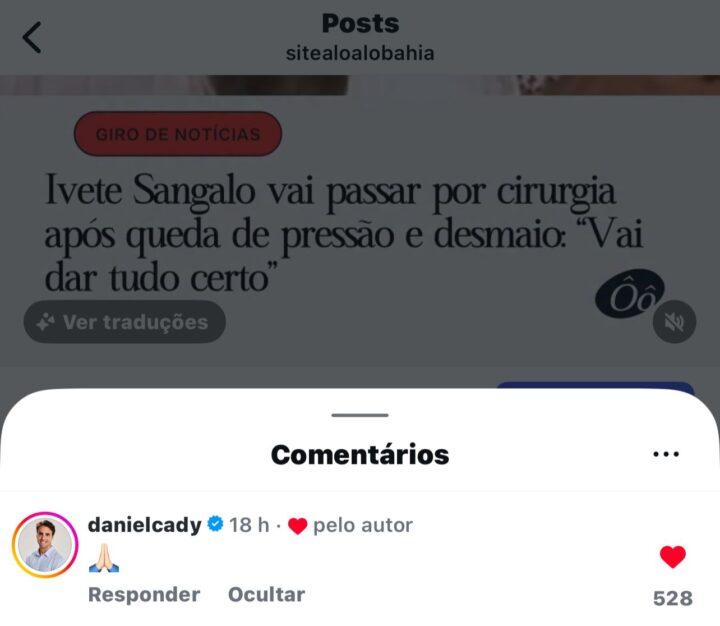 O nutricionista Daniel Cady, ex-marido da cantora Ivete Sangalo, comentou neste domingo (1) a postagem do Alô Alô Bahia sobre a cirurgia que a artista realizou. Ele publicou apenas um emoji de oração (🙏🏻), que já acumulou mais de 520 curtidas.