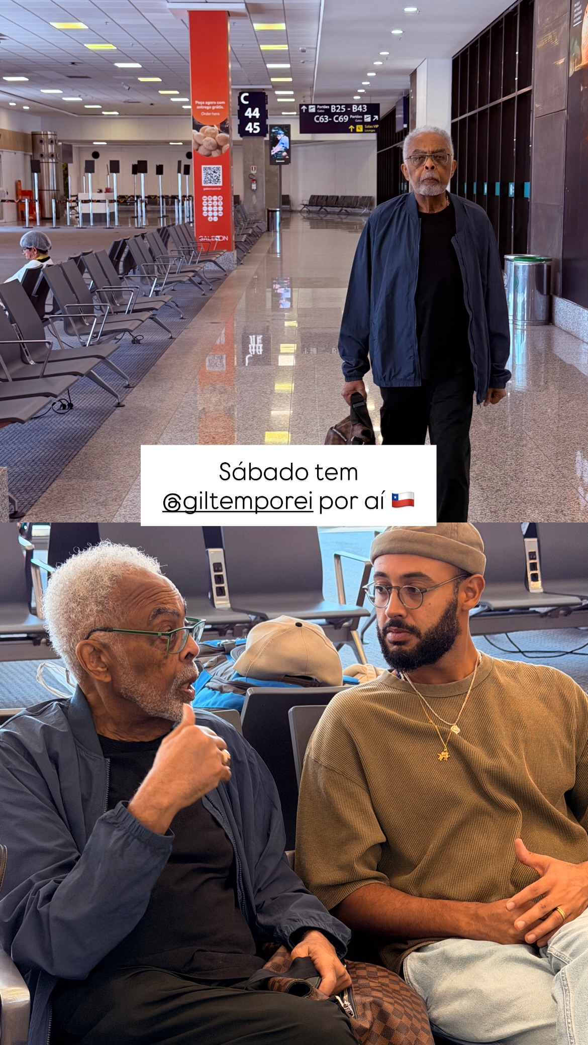 O cantor Gilberto Gil compartilhou nesta quarta-feira (5) que já chegou a Santiago, no Chile, onde se apresenta com a turnê de despedida “Tempo Rei – Última Turnê”.