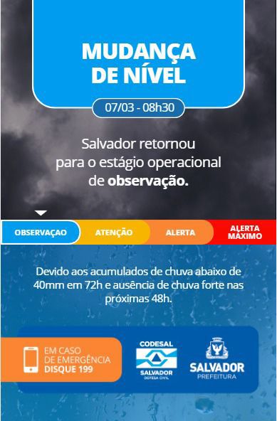 A capital baiana retornou para o Nível de Observação após registrar acumulados de chuva abaixo de 40mm em 72h e ausência de chuvas fortes nas próximas 48h. As informações foram divulgadas pela Defesa Civil de Salvador neste sábado (7).
