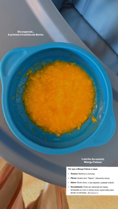 Dia especial. A primeira frutinha de Bento (…) A escolhida pro lanche da manhã foi a manga palmer, que tem uma textura cremosa, é rica em fibras, quase zero fiapos e sabor doce, que agrada o paladar infantil. Além disso, é muito versátil, pode ser oferecida amassa, em pedaços ou com caroço para ajudar na dentição”, contou Carol.