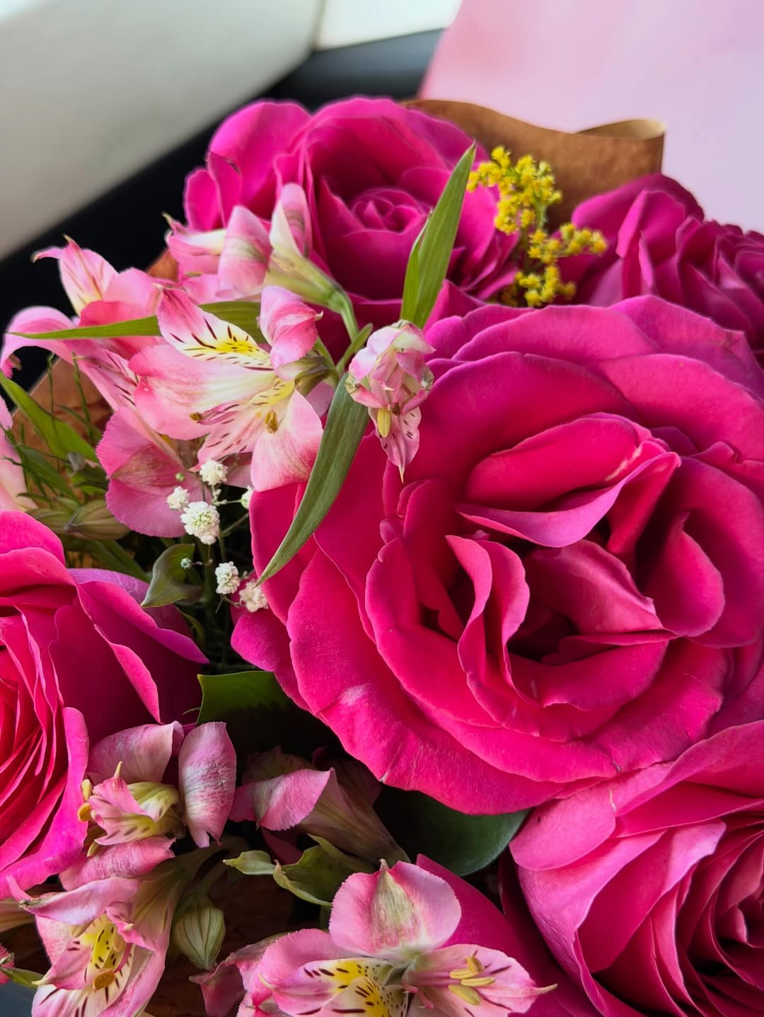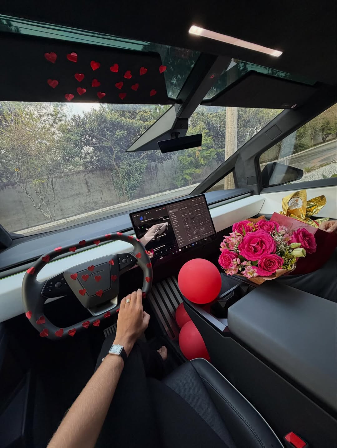 Na foto compartilhada, Sthefane aparece sorridente recebendo o buquê de flores e o presente de Kevi, diante do carro futurista estacionado na entrada de sua residência.