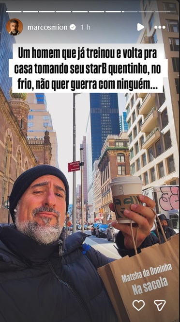 Mesmo em clima de viagem, o apresentador revelou que não abriu mão da rotina de treinos e logo cedo, compartilhou parte do dia a dia. “Um homem que já treinou e volta para casa tomando sua bebida quentinha, no frio, não quer guerra com ninguém. Matcha da Doninha na sacola”, escreveu.