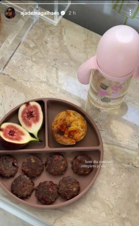 Nos stories, Jade mostrou que a menina segue uma alimentação equilibrada, com refeições completas e sem produtos industrializados. “Bom dia com café completo para ela”, escreveu.