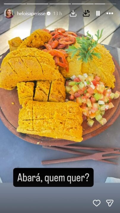 Em um dos cliques, Heloisa mostrou que entrou no clima baiano ao aproveitar a culinária local. “Abará, quem quer?”, escreveu ao exibir o prato típico.