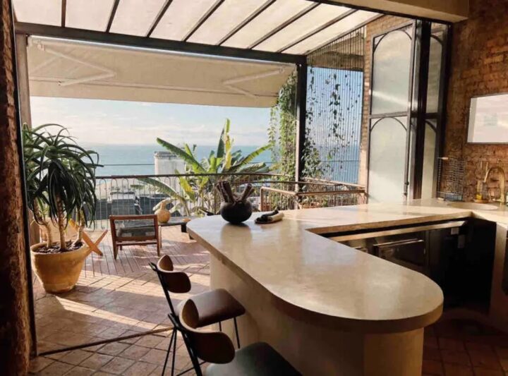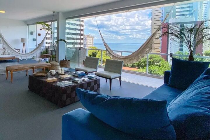 Localizada na Barra, a cobertura de 480 m² tem vista direta para o Farol da Barra, além do oceano e da Ilha de Itaparica. O imóvel conta com quatro quartos, sete banheiros, piscina, churrasqueira e estrutura completa para grupos de até 14 pessoas.
