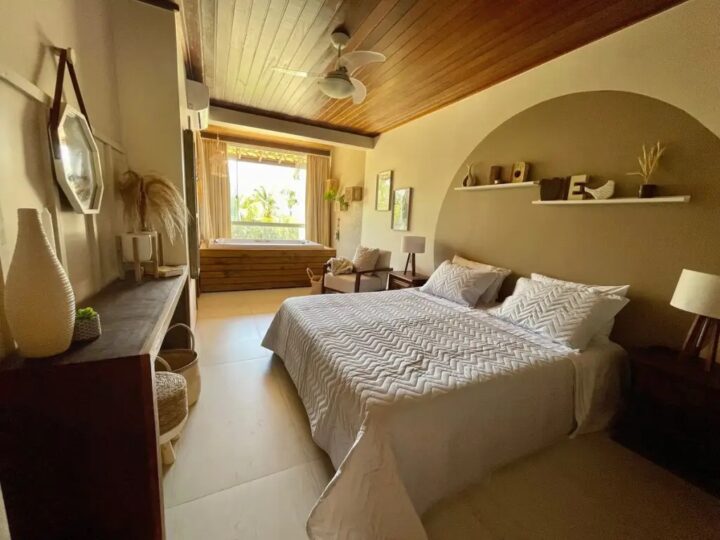 Na Praia do Flamengo, o imóvel oferece acesso direto à praia e estrutura com piscina, hidromassagem e área gourmet. Com três quartos, acomoda até oito hóspedes e fica a cerca de 10 minutos do aeroporto. Nas proximidades estão a Barraca do Lôro e o Pipa Beach Club.