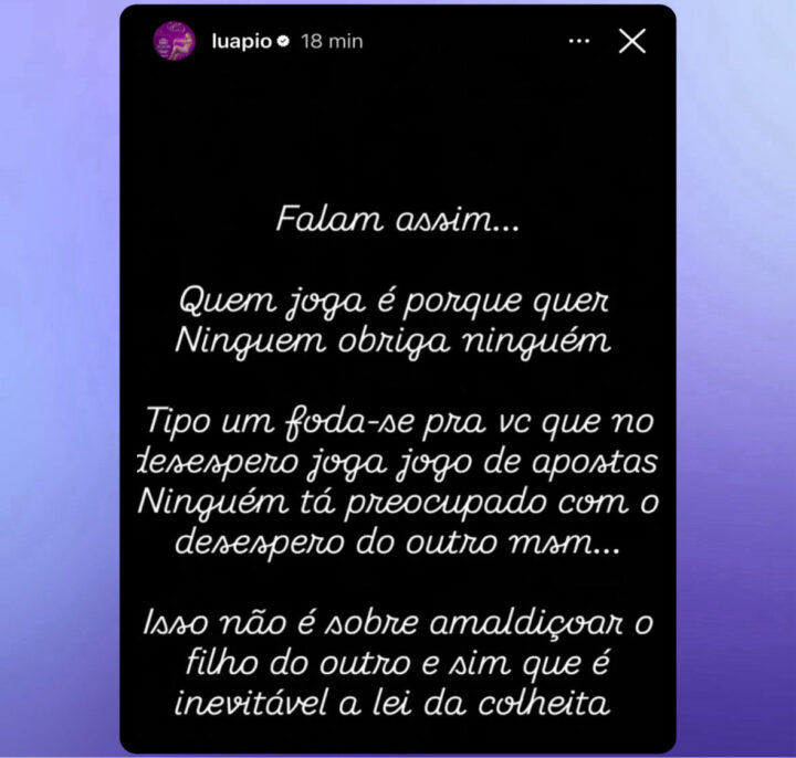 “Falam assim… Quem joga é porque quer, ninguém obrigada ninguém. Tipo um foda-se pra você que no desespero joga jogo de apostas. Ninguém está preocupado com o desespero do outro mesmo… Isso não é sobre amaldiçoar o filho do outro e sim que é inevitável a lei da colheita“, diz a postagem .