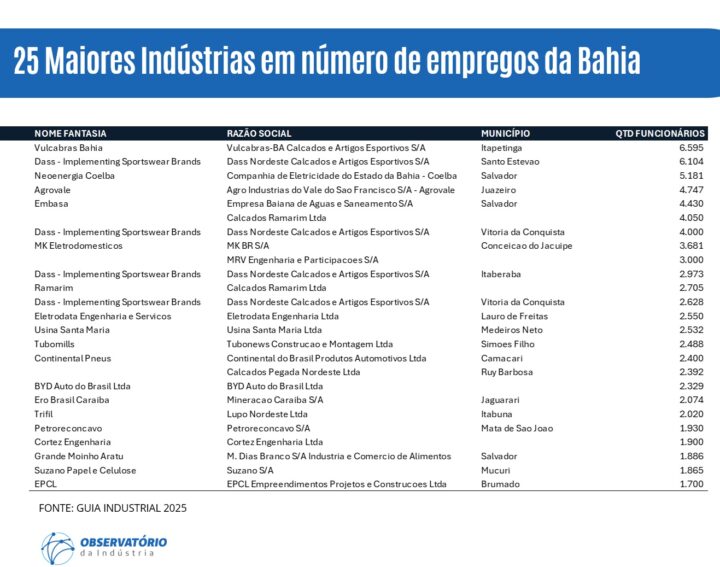 As indústrias seguem como um dos principais motores de geração de empregos na Bahia, com milhares de postos distribuídos por diferentes regiões do estado. Levantamento do Guia Industrial da FIEB aponta as 25 maiores empregadoras do setor, revelando a força de segmentos como calçados, energia, saneamento e construção.