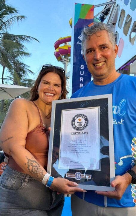 “Eu desci a maior monta-russa aquática do mundo, meu amor. Título do Guinness Book. Estou muito feliz de fazer parte disso“, celebrou Thais.
