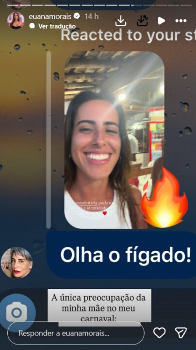 Ao ver que a filha estava se divertindo sem limites, Gloria, como qualquer mãe, enviou uma mensagem de alerta: “Olha o fígado”. Ana, por sua vez, se divertiu com o recado bem-humorado da mãe e brincou: “A única preocupação da minha mãe no meu Carnaval”.